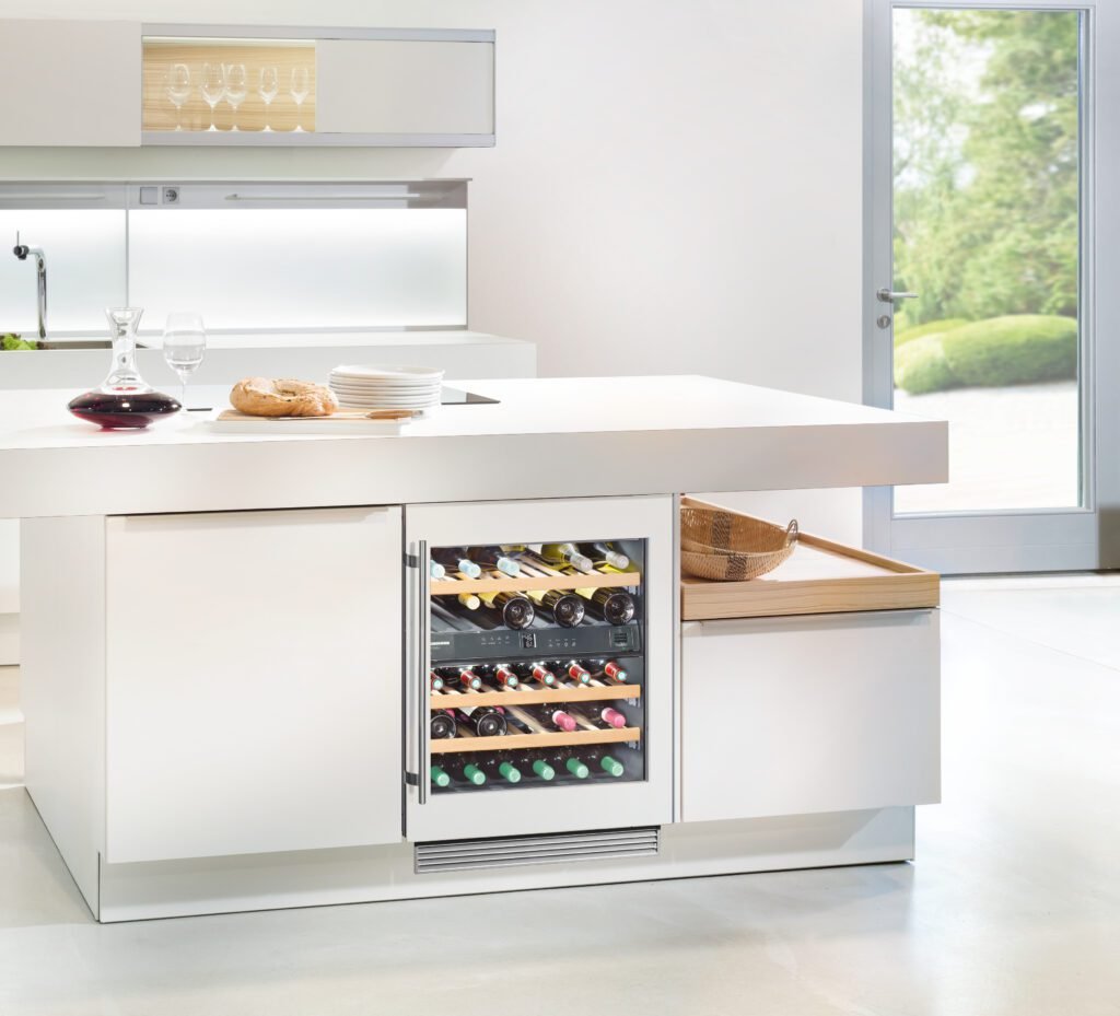 Adegas de vinhos e beverage center – para a melhor preservação de vinhos finos, que demandam controle de umidade, luz e temperatura, a Liebherr oferece três opções de adegas de piso ou semiembutimento, com tamanhos entre 60 cm e 71 cm, com capacidade de 34 a 178 garradas e com duas ou três zonas de temperatura. O beverage center garante bebidas geladas na temperatura ideal para as áreas de lazer, com capacidade para 114 latas.